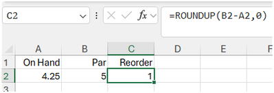 Hi, I have a stock ordering sheet where the stock in hand is 4.25 and par stock is 5 order number is .75 round up to 1, however the order value is calculating at .75 not 1