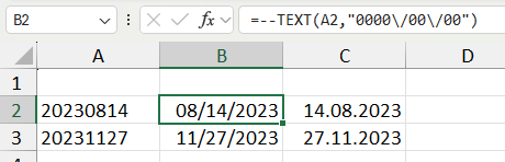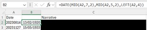Hi Brains Trust, I am trying to convert an 8-digit reverse date text string in to dd/mm/yyyy date format. What am I doing wrong? Column A is 'Text', Column B is 'Date' set to dd/mm/yyyy. I just ne...