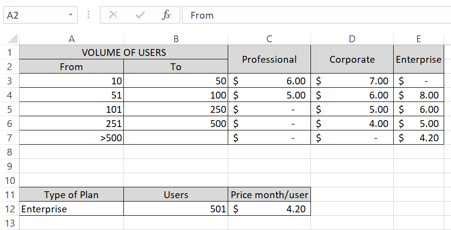 I am trying to create a calculator where depending on the plan you select, and the number of users you add to this calculator, the € user/month appears on a cell.