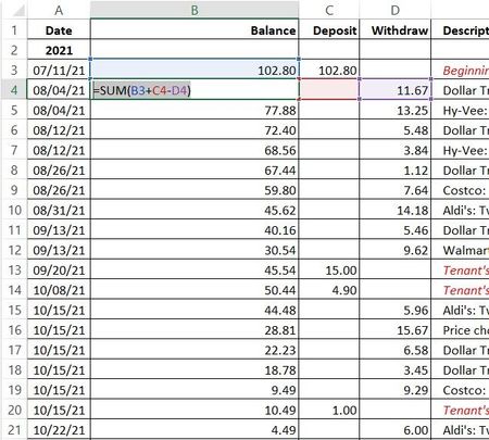 If you just copy that formula down the column it will do what you want. Edit....Copy when your cursor is in cell B4, then Edit Paste in all rows below. That's all I did in the attached demo file. There is absolutely no need to re-type the formula each time.