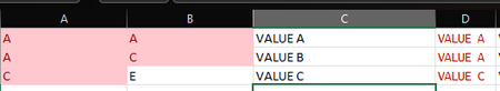 So, in my example, if B1 is "A", then A is present two times in column A, so I have to pick value from C1 column ("Value A") and paste it in D column each time B1 value is in A column.