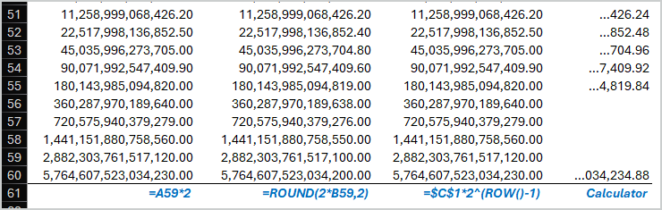 This behavior is caused by Excel’s use of binary floating-point arithmetic, not a calculation bug. Excel stores numbers using the IEEE 754 standard, and many decimal fractions like 0.01 cannot be represented exactly in binary. Each time you multiply by 2, the tiny approximation error doubles. By day 49–51, this accumulated error affects the last cent, which is why you see .20 instead of .24 and .50 instead of .48. Formatting as Currency only changes the display, not the stored value. Microsoft documents this here: https://learn.microsoft.com/office/troubleshoot/excel/floating-point-arithmetic-inaccurate-result. To avoid this, either work in whole integers (e.g., cents) and convert to dollars for display or round at each step using =ROUND(A1*2,2). Either approach prevents cumulative rounding errors.
