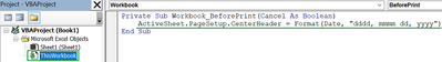 Private Sub Workbook_BeforePrint(Cancel As Boolean) ActiveSheet.PageSetup.CenterHeader = Format(Date(),"dddd, mmmm dd, yyyy") End Sub