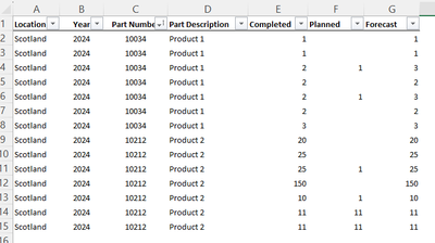 I have data which covers a number of customers and manufacturing dates however the part number is same. I would like to reduce each unique part number into one line but summing up the values in columns E, F & G.