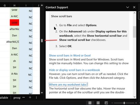 The horizontal scroll bar is missing on my spreadsheet. The vertical scroll bar is working OK The boxes for Horizontal and vertical scroll bars are both ticked. The horizontal scroll bar disappear...