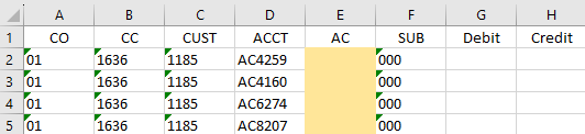 - If value is positive, I will need it to populate for the corresponding account in column G, if it is negative it should populate in column H (these should populate on the same line as column E if it populates)