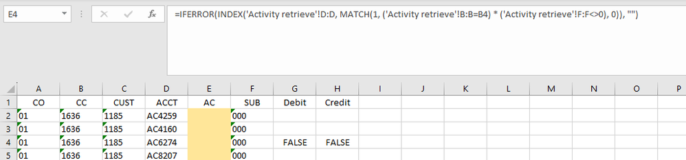 =IF(E4="","",IFERROR(1/(1/MAX(0,-INDEX('Activity retrieve'!F:J,MATCH(1,('Activity retrieve'!B:B=D4)*(INDEX('Activity retrieve'!F:J,0,MATCH(B4,'Activity retrieve'!$F$1:$J$1,0))<>0),0),MATCH(B4,'Activity retrieve'!$F$1:$J$1,0)))),""))Really appreciate your help once again! Really unsure what I could be incorrectly inputting to make these formulas not work. I also attempted to attached a condensed version of the workbook but not sure I have the ability to.