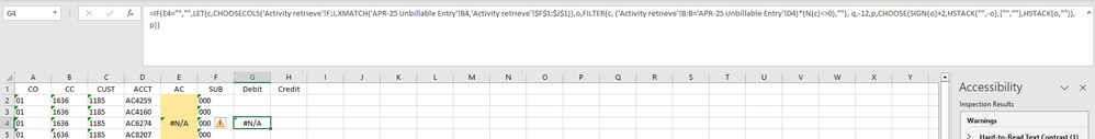 =IF(E4="","",LET(c,CHOOSECOLS('Activity retrieve'!F:J,XMATCH('APR-25 Unbillable Entry'!B4,'Activity retrieve'!$F$1:$J$1)),o,FILTER(c, ('Activity retrieve'!B:B='APR-25 Unbillable Entry'!D4)*(N(c)<>0),""), q,-12,p,CHOOSE(SIGN(o)+2,HSTACK("",-o),{"",""},HSTACK(o,"")),p))The 2nd group of suggestions for old excel didn't populate anything for column E, G, or H.