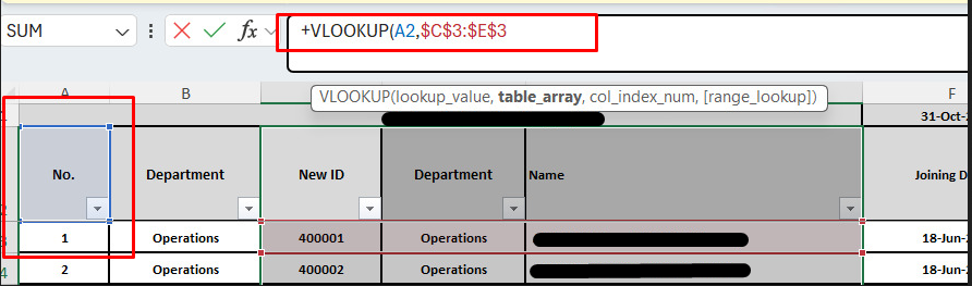 =VLOOKUP(A2, Sheet2!$C$3:$E$100, 2, FALSE)4. Update Excel