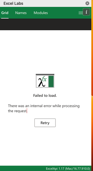 Hi all! I installed Excel Labs from Add-ins store, but it won't load for me. Anyone ran into this before? Please help! thanks in advance! btw, I am using it on Mac, here is the version:...