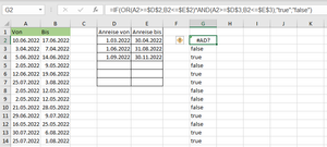 For example: As you can see from the image, I want the red ones to be "false" because, they are not included between (01.03.2022/30.04.2022 and 01.06.2022/31.08.2022). I want to have the ones that belong inside that two certain dates as "true" not all of them.