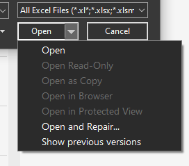 Also Notice the Open Button has a Drop down arrow and you can Open and repair the file...