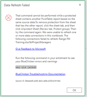 This error occurs when I try to open the Excel file in Teams or using the Browser (MS Edge). What is BlueChicken? Note: the excel file opens and seems to be working fine after pressing ...