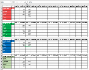 1. We add 3 new columns (G, H, I, in the example), which goal is to count the number of weeks that the player got in with each range of %: