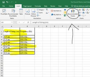 What that message is telling you is that your data is text, not numbers. I know, they look like numbers to you, but they're stored as text. The column headings say "cm" and "Hz"--rely on that to make clear that the numbers below are, well, cm and Hz. Take away the letters designating them so, make sure then that you've got only numbers .... here, in the attached I've done it for you. See if the "recommended chart" link works now.
