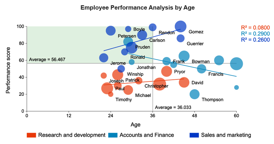 In Scatter plot (attached herewith), you can set circle size, color, trend lines for each metric, R-Square metric, most interested quadrant selection, more info you can find https://chartexpo.com/utmAction/NCtNVEMreGwrUUorTVNPRlRDTVQr.