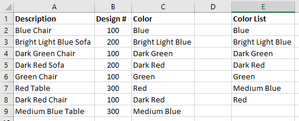 Hello, I have a list of product descriptions (Column A) that contain the color and product type. I'm trying to separate the color into another column (Column C) so that I can sort by Design # (Co...