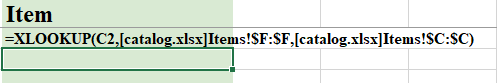 =XLOOKUP(C2,[catalog.xlsx]Items!$F:$F,[catalog.xlsx]Items!$C:$C)