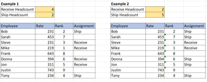 so the employees can be staffed in either department. I want to be able to staff each area based upon need with the best employees (highest rates). But I don't want to give one department the highest rates employees and leave the other department with lower rate employees. I think of it as a total ranked pool that will be split between two areas based upon need. The cells in gold is where I would input my need for each department. Once inputed, the assignment column would calculate and show which employees to select and which department.