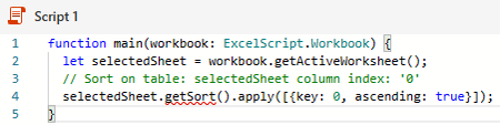 function main(workbook: ExcelScript.Workbook) { let selectedSheet = workbook.getActiveWorksheet(); // Get 1st Table on selectedSheet let firstTable = selectedSheet.getTable(0); firstTable.getSort().apply([{ key: 0, ascending: true }]); }And instead of by ID, by your Table name: