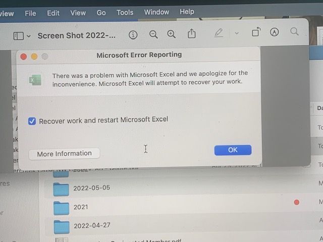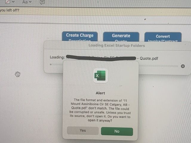 "The file format and extension of '19 Schubert Hill NW Calgary, AB - Quote.pdf' don't match. The file could be corrupted or unsafe. Unless you trust its source, don't open it. Do you want to open it anyway? "... if I select no another file opens with the same message and then I'm in a loop. After I try to close the file I receive a Microsoft Error Report that says there was a problem and Excel will attempt to recover my work. When I click on the "More Information" button I see the error report but don't know what to do with it. Attached are the screen shots ,of the error windows and details. Please help, Cheers, Paul