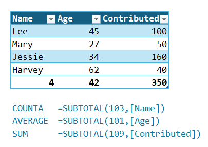 You can copy the formula across the total row to either return sums or other aggregated values.