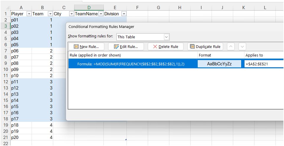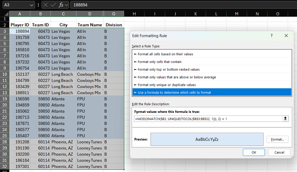 I tried both solutions and they both worked. The only difference is that with =MOD(XMATCH($B3, UNIQUE(TOCOL($B$3:$B$32, 1))), 2) = 1 I had to change the $B$32 to something like $B$1000 just in case I add more teams.