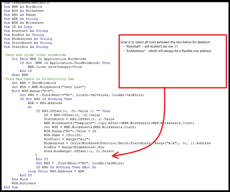 Sub CreateNewUserTab11184() Dim WBK As Workbook Dim WSH As Worksheet Dim RNG1 As Range Dim RNG2 As Range Dim ADR1 As String Dim ADR2 As String Dim WSN As Worksheet Dim ID As Long Dim RowStart As String Dim RowEnd As String Dim EndAddress As String Dim StartAddress As String Dim StartMonth As Date Dim EndMonth As Date Dim StartRow As String Dim LR As Long 'Save and close other workbooks For Each WBK In Application.Workbooks If Not (WBK Is Application.ThisWorkbook) Then WBK.Close SaveChanges:=True End If Next WBK 'Find New Users on Productivity Tab Application.ScreenUpdating = True Set WBK = ThisWorkbook Set WSH = WBK.Worksheets("User List") With WSH.Range("F:F") Set RNG1 = .Find(What:="No", LookIn:=xlValues, Lookat:=xlWhole) If Not RNG1 Is Nothing Then Do ADR1 = RNG1.Address Set RNG2 = RNG1.Offset(0, -5) ADR2 = RNG2.Address If RNG2.Value <> "" Then ID = RNG2.Value StartMonth = RNG1.Offset(0, 1).Value 'Copy template to end of sheets WBK.Worksheets("Template").Copy After:=WBK.Worksheets(WBK.Worksheets.Count) Set WSN = WBK.Worksheets(WBK.Worksheets.Count) 'Update ID Cell and Tab Name on new sheet WSN.Range("B8").Value = ID WSN.Name = CStr(ID) 'Identify future month rows to remove 'WSN.Range("A11") = RowStart If RNG1.Offset(0, 2).Value <> "" Then EndMonth = RNG1.Offset(0, 2).Value EndAddress = Cells(WorksheetFunction.Match(CLng(EndMonth), Range("A:A"), 0), 1).Address RowEnd = Range(EndAddress).Row WSN.Range("A11:A" & RowEnd - 1).EntireRow.Delete End If 'Identify pre-start month rows to remove StartAddress = Cells(WorksheetFunction.Match(CLng(StartMonth), Range("A:A"), 0), 1).Address RowStart = Range(StartAddress).Row LR = Cells(Rows.Count, 1).End(xlUp).Row WSN.Range("A" & RowStart + 1 & ":A" & LR).EntireRow.Delete 'Update New Sheet Caluclation References WSN.Range("B1").Formula = "=B9" WSN.Range("B3").Formula = "=SUM(G9,J9,N9)" WSN.Range("B5").Formula = "=Q9" WSN.Range("B9").Formula = "=SUM($AL$11:$AL$33)" WSN.Range("G9").Formula = "=SUM($AO$11:$AO$33)" WSN.Range("J9").Formula = "=SUM($AM$11:$AM$33)" WSN.Range("N9").Formula = "=SUM($AN$11:$AN$33)" WSN.Range("Q9").Formula = "=SUM($AK$11:$AK$21)" WSN.Range("T9").Formula = "=SUM($AI$11:$AI$33)" WSN.Range("Y9").Formula = "=SUM($AH$11:$AH$33)" WSN.Range("AB9").Formula = "=SUM($AJ$11:$AJ$33)" WSN.Range("AH11").Formula = "=COUNTIF($B11:$AF11,""B"")" WSN.Range("AI11").Formula = "=SUMPRODUCT(VALUE($AR11:$BV11))" WSN.Range("AJ11").Formula = "=COUNTIF($B11:$AF11,""=""&""J"")" WSN.Range("AK11").Formula = "=COUNTIF($DD11:$EH11,""=""&""1"")" WSN.Range("AL11").Formula = "=COUNTIF($EJ11:$FN11,""=""&""1"")" WSN.Range("AM11").Formula = "=SUM(FP11:GT11)" WSN.Range("AN11").Formula = "=SUM(IB11:JF11)" WSN.Range("AO11").Formula = "=SUM(GV11:HZ11)" WSN.Range("AK23").Formula = "=IF(AND(SUM($DD23:$EH23)>0,SUM($AK11:$AK21)=0),0,SUM($DD23:$EH23))" WSN.Range("AM23").Formula = "=IF(AND(SUM(FP23:GT23)>0,SUM(AM11:AO21)=0),0,SUM(FP23:GT23))" WSN.Range("AN23").Formula = "=IF(AND(SUM(IB23:JF23)>0,SUM(AM11:AO21)=0),0,SUM(IB23:JF23))" WSN.Range("AO23").Formula = "=IF(AND(SUM(GV23:HZ23)>0,SUM(AM11:AO21)=0),0,SUM(GV23:HZ23))" WSN.Rows("35:36").EntireRow.Copy WSN.Rows("35:36").EntireRow.PasteSpecial xlPasteValues 'Update User List to create links to newly created user tabs WSH.Hyperlinks.Add Anchor:=RNG2, Address:="", SubAddress:="'" & WSN.Name & "'!A1" End If 'RNG1.Value = "Yes" Set RNG1 = .Find(What:="No", Lookat:=xlWhole) If RNG1 Is Nothing Then Exit Do Loop Until RNG1.Address = ADR1 End If End With WSH.Activate Application.CutCopyMode = False Application.ScreenUpdating = True End Sub