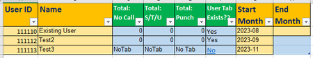Sub CreateNewUserTabCCCCCV2() Dim WBK As Workbook Dim WSH As Worksheet Dim RNG1 As Range Dim RNG2 As Range Dim ADR1 As String Dim ADR2 As String Dim WSN As Worksheet Dim ID As Long Dim RowStart As String Dim RowEnd As String Dim EndAddress As String Dim StartAddress As String Dim StartMonth As String Dim StartRow As String Dim LR As Long 'Save and close other workbooks For Each WBK In Application.Workbooks If Not (WBK Is Application.ThisWorkbook) Then WBK.Close SaveChanges:=True End If Next WBK 'Find New Users on Productivity Tab Application.ScreenUpdating = False Set WBK = ThisWorkbook Set WSH = WBK.Worksheets("User List") With WSH.Range("F:F") Set RNG1 = .Find(What:="No", LookIn:=xlValues, Lookat:=xlWhole) If Not RNG1 Is Nothing Then Do ADR1 = RNG1.Address Set RNG2 = RNG1.Offset(0, -5) ADR2 = RNG2.Address If RNG2.Value <> "" Then ID = RNG2.Value StartMonth = RNG1.Offset(0, 1).Value 'Copy template to end of sheets WBK.Worksheets("Template").Copy After:=WBK.Worksheets(WBK.Worksheets.Count) Set WSN = WBK.Worksheets(WBK.Worksheets.Count) 'Update ID Cell and Tab Name on new sheet WSN.Range("B8").Value = ID WSN.Name = CStr(ID) 'Identify future month rows to remove WSN.Range("A11") = RowStart EndAddress = WSN.Cells(WorksheetFunction.Match(StartMonth, WSN.Range("A:A"), 0), 1).Address RowEnd = WSN.Range(EndAddress).Row WSN.Range("A11:A" & RowEnd - 1).EntireRow.Delete 'Identify pre-start month rows to remove StartAddress = WSN.Cells(WorksheetFunction.Match(StartMonth, WSN.Range("A:A"), 0), 1).Address RowStart = WSN.Range(StartAddress).Row LR = WSN.Cells(WSN.Rows.Count, 1).End(xlUp).Row WSN.Range("A" & RowStart + 1 & ":A" & LR).EntireRow.Delete 'Update New Sheet Caluclation References WSN.Range("B9").Formula = "=SUM($AL$11:$AL$33)" WSN.Range("G9").Formula = "=SUM($AO$11:$AO$33)" WSN.Range("J9").Formula = "=SUM($AM$11:$AM$33)" WSN.Range("N9").Formula = "=SUM($AN$11:$AN$33)" WSN.Range("Q9").Formula = "=SUM($AK$11:$AK$21)" WSN.Range("T9").Formula = "=SUM($AI$11:$AI$33)" WSN.Range("Y9").Formula = "=SUM($AH$11:$AH$33)" WSN.Range("AB9").Formula = "=SUM($AJ$11:$AJ$33)" WSN.Range("B1").Formula = "=B9" WSN.Range("B3").Formula = "=SUM(G9,J9,N9)" WSN.Range("B5").Formula = "=Q9" 'Update User List to create links to newly created user tabs WSH.Hyperlinks.Add Anchor:=RNG2, Address:="", SubAddress:="'" & WSN.Name & "'!A1" End If RNG1.Value = "Yes" Set RNG1 = .Find(What:="No", After:=RNG1, Lookat:=xlWhole) If RNG1 Is Nothing Then Exit Do Loop Until RNG1.Address = ADR1 End If End With WSH.Activate Application.ScreenUpdating = True End Sub