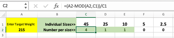 The first formula, in cell C2, (to calculate how many 45 lb weights might be needed) is this: