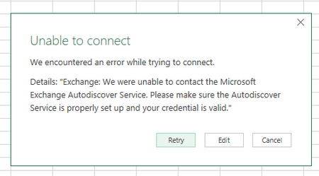 Hello, I'm using Office 365 when I'm trying to use New Query to get data from my email (Exchange Online source) I receive this error: Exchange: We were unable to contact the Microsoft Exchang...