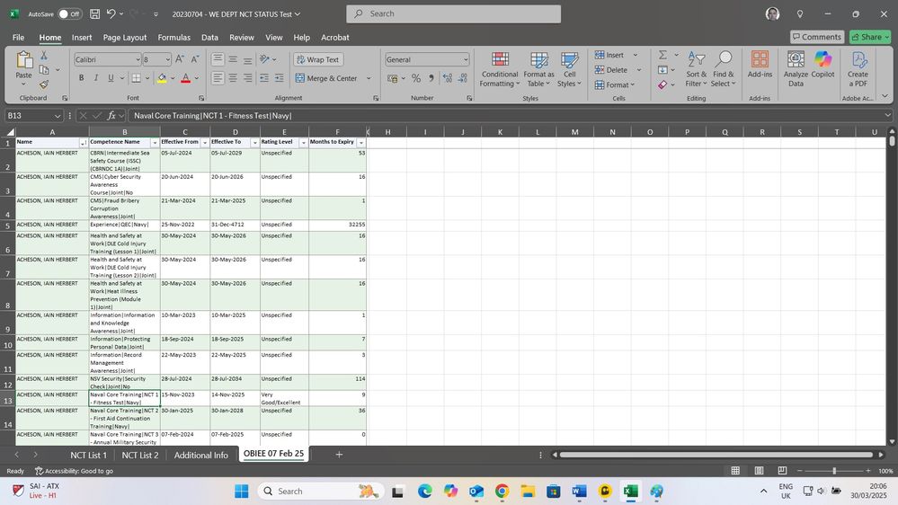 What I'd like to do is for each data tab, 1 - 3, is it to autmatically look at the raw data in tab 4 and auto populate, just not sure of the formula set to use, so for example, in tab 1, the first person is Acheson, Iain, what I want cell B2 to do is look in tab 4 against the name Acheson, Iain and return the date from cell D13 in this instance.