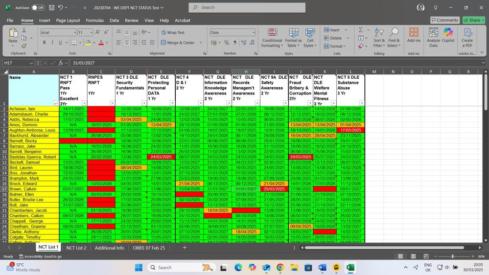 The first three tabs are already conditionally formatted so 30 days before going out of date the box goes amber and when out of date goes red, if in date it is green.