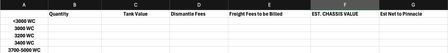 In columns B should calculate Quantity for each type of tanks from Column A (from main Excel sheet) and columns C D E F G in Summary sheet should pull data from MasterTank list sheet columns - F H I K L, also column K should calculate value based on Tank size Quantities $1000 for Less than 3000 WC and $1500 for rest all Tanks types.(if Less than 3000 WC tanks are 20 types so K column value for this tank type should be $30000 and so on for rest columns.)