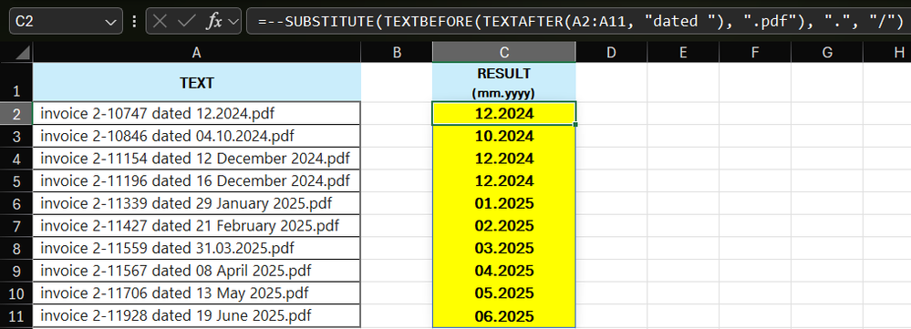 =--SUBSTITUTE(TEXTBEFORE(TEXTAFTER(A2:A11, "dated "), ".pdf"), ".", "/")I have formatted the cells in column C as dates, so mm.yyyy