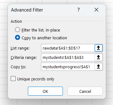 I have tried using the advanced filter and selecting the "Copy to another location" button then setting the List Range: rawdata, Criteria range: mystudents but this is not working. Am I using the correct function to accomplish this? Any ideas?