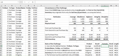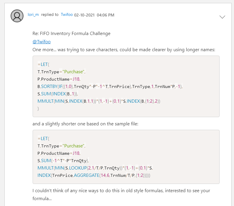 = LAMBDA(prNm, LET( type, -(EVEN(TrnType="Sale")-1), prod, (ProductName=prNm), table, CHOOSE({1,2,3,4},TrnNum,TrnQty*type, TrnPrice, type*prod), total, SUM(INDEX(FILTER(table,prod),0,2)), two, INDEX(SORT(FILTER(table, prod*type=1),,-1),{1;2},{2,3}), price, INDEX(two,,2), lastQty, MIN(total, INDEX(two,1,1)), QTYs, CHOOSE({1;2}, lastQty, total-lastQty), SUM(QTYs*price)) )(@Product)I have yet to clarify thoughts on how the solutions to such problems might best be packaged. One option might be to output the results to a table and create a rich data type with inventory quantities and values as attributes. Another might be to use recursion to generate values for the five product lines as a single array.