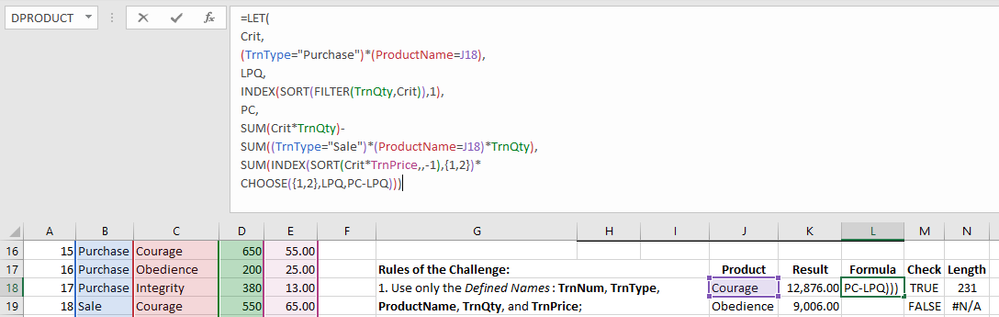 =LET( T,TrnType="Purchase", P,ProductName=J18, S,SUM(-1^T*-P*TrnQty), MMULT(MIN(S,LOOKUP(2,1/T/P,TrnQty))*{1,-1}+{0,1}*S, INDEX(TrnPrice,AGGREGATE(14,6,TrnNum/T/P,{1;2}))))I couldn't think of any nice ways to do this in old style formulas, interested to see your formula...