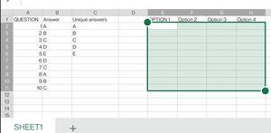 Dear Members, I just wanted to create MCQ Quiz sheet. I submitted a sample screen shot. I found the unique values using unique command in column 'C'. Now i wanted to fill option 2,3,4(i.e F2,G2,H2...