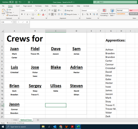See the attached workbook for alternatives where you assign the crew leader next to the apprentice (so no highlighting of the apprentice list is needed). And the formulas just beneath each Crew Leader name on the left pull from that list ... or from an Excel table, as on Sheet3: