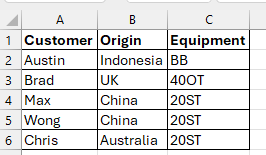 =XLOOKUP( A10 & "_" & B10, Table3[Customer] & "_" & Table3[Origin], Table3[Equipment], "Not found" )where Table3 refers to a table as shown in the picture below.