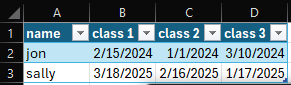 =PIVOTBY(table[name], table[class], table[date], MAX,,0,,0)