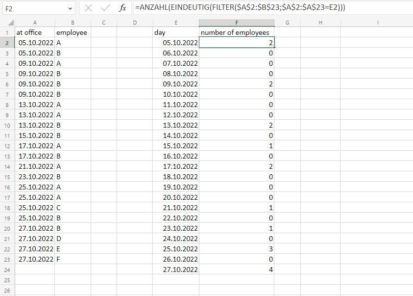 =COUNT(UNIQUE(FILTER($A$2:$B$23,$A$2:$A$23=E2)))If you have Office365 or Excel 2021 or Excel online you can try this formula.