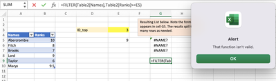 I tried running the formula myself in cell G9 and get the message that "the function isn't valid".
