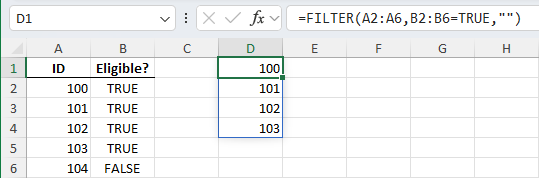 Below is my data I want to filter. "ID" column is column A, "Eligible?" column is B, data are in rows 2-6.