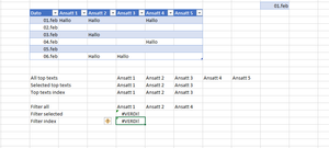 =FILTER(INDEX(Tabell1[#Headers];;2):INDEKS(Tabell1[#Headers];;4);FILTER(INDEX(Tabell1;;2):INDEX(Tabell1;;4);Tabell1[Dato]=K2)="hallo";"")