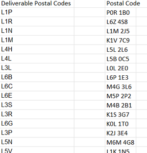 Use VLOOKUP to find the first three characters from all the postal codes in the list of "deliverable codes", as demonstrated in the picture below. #N/A means that the code is not deliverable.