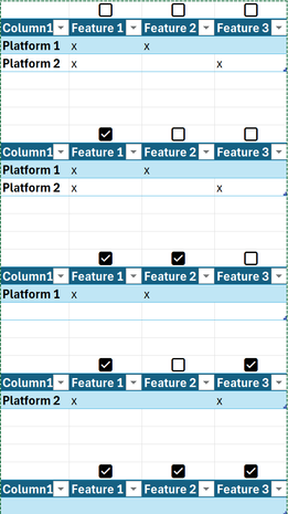 I want to make a feature/application matrix where you can choose features by clicking on a checkbox and the filter needs to show only the application where all the chosen (checked) are available.