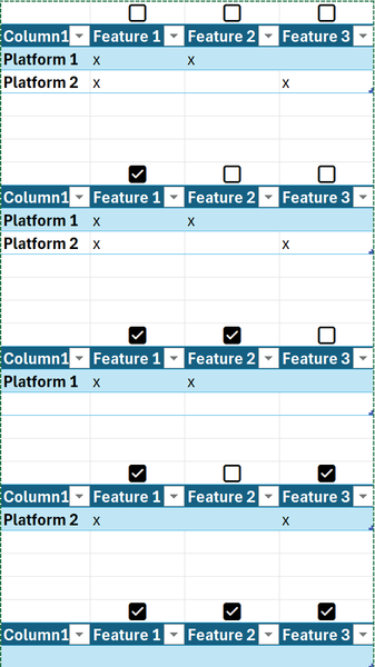 I want to make a feature/application matrix where you can choose features by clicking on a checkbox and the filter needs to show only the application where all the chosen (checked) are available. So...