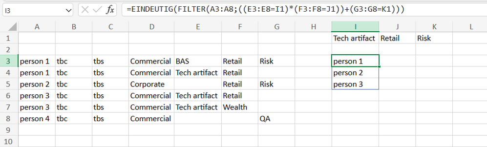 With this multiple filter criteria we can return a person who is a specialist in Tech Artifacts in Retail or anybody with Risk knowledge at the same time. With UNIQUE each person is only returned once because Person 1 is specialist in both categories and would be returned twice without UNIQUE.